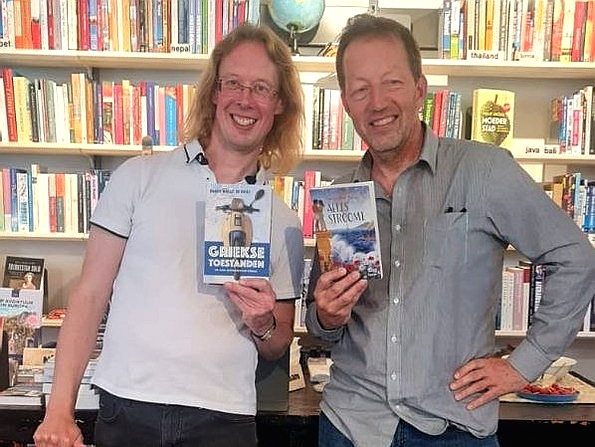 Frans van Hilten en Ruard Wallis de Vries met elkaars boek. | Met Maaike Wieringa bij boekhandel Colette |